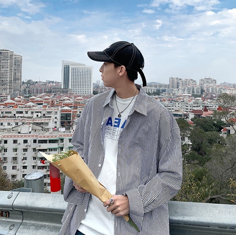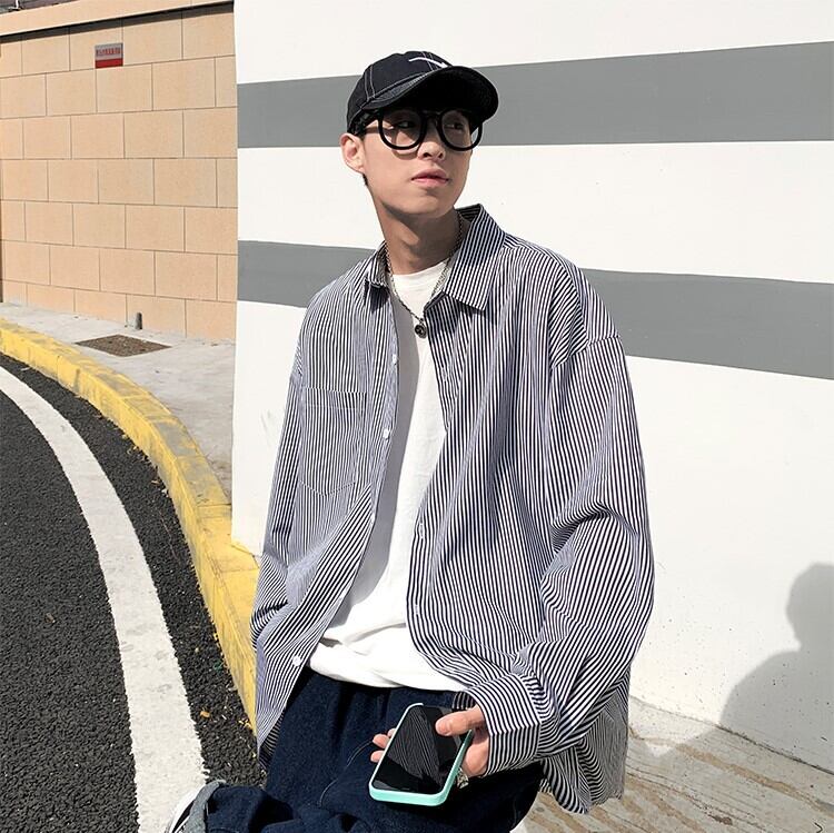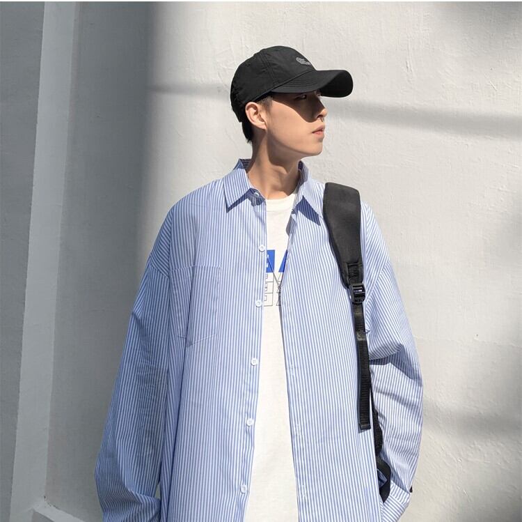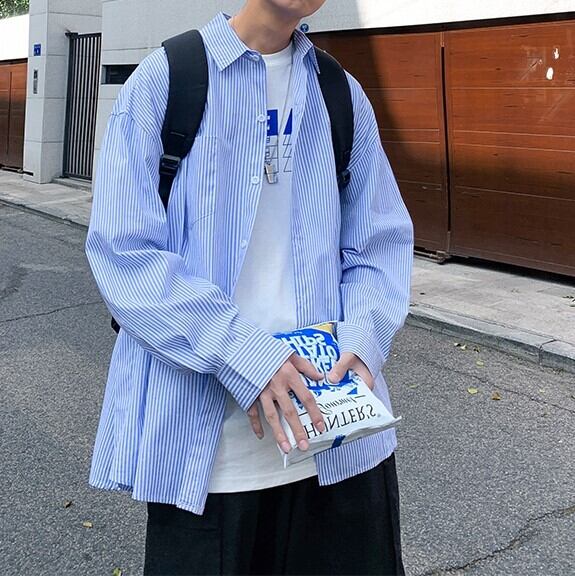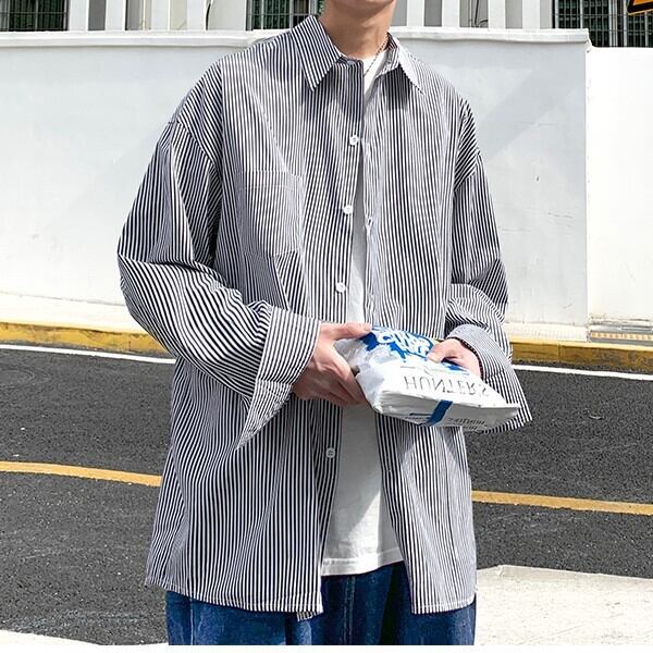 【韓国メンズファッション】BW582 ストライプ 長袖 シャツ カッターシャツ スクエアカラー オーバーサイズ