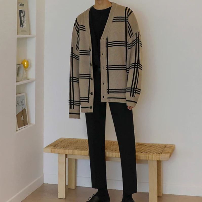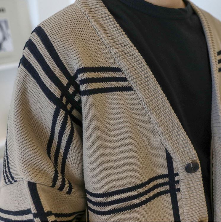 【韓国メンズファッション】人気 ニット ルーズ チェック柄 カーディガン 長袖 カジュアルトップス BW776