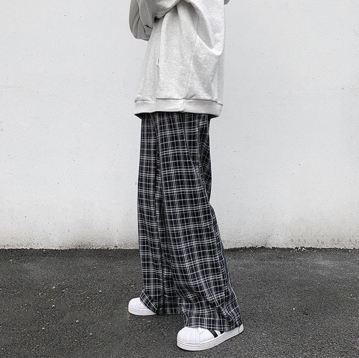 【韓国メンズファッション】メンズ ワイドレッグパンツ チェック ビッグサイズ ストレート カジュアルパンツ BW1194