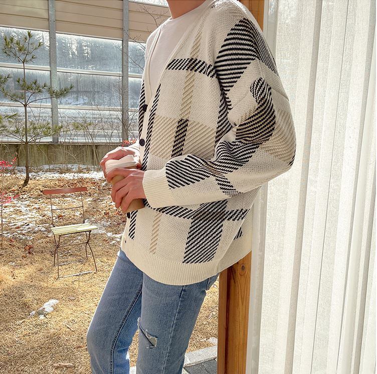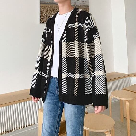 【韓国メンズファッション】人気 チェック柄 Vネック カーディガン長袖 ドロップショルダー トレンド ルーズ カジュアル BW1804