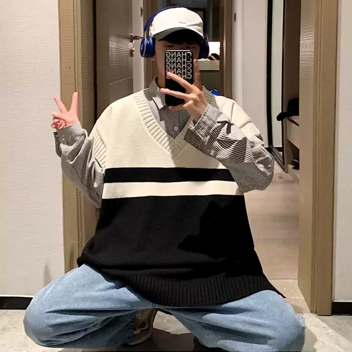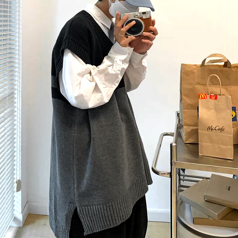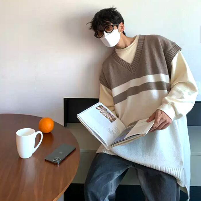 【韓国メンズファッション】ベスト Vネック バイカラー ボーダー カジュアル 大きいサイズ おでかけ デート BW1873
