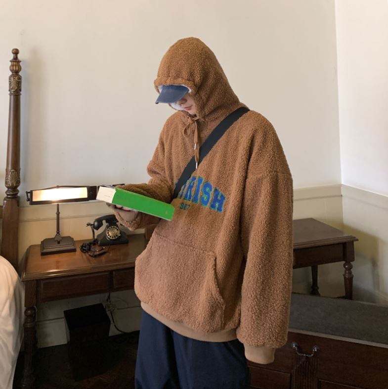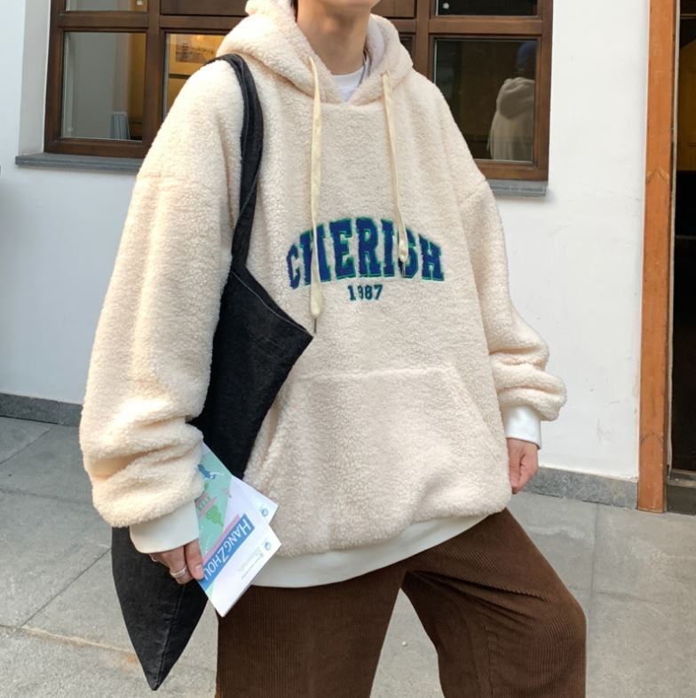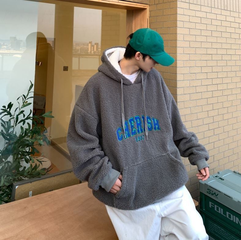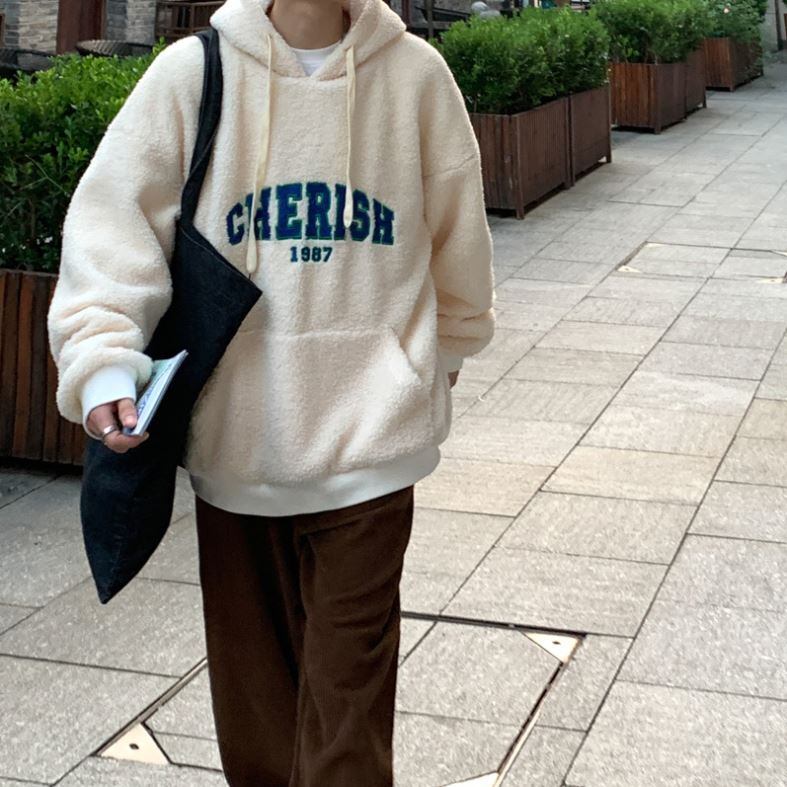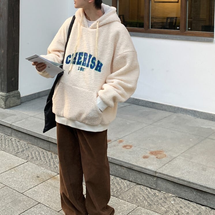【韓国メンズファッション】ボアフリース プルオーバーパーカー 長袖 無地 ロゴ刺しゅう オーバーサイズ シンプル ゆったり カジュアル BW2041