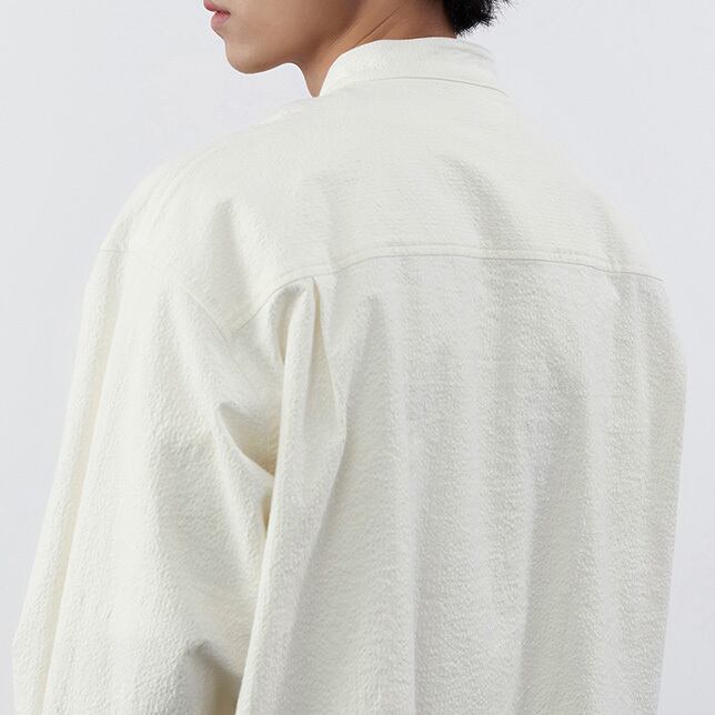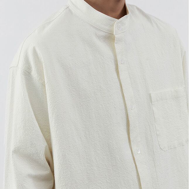 【韓国メンズファッション】スタンドカラー長袖シャツ ポケット サッカー生地 ゆったりシンプル ミニマル BW2135