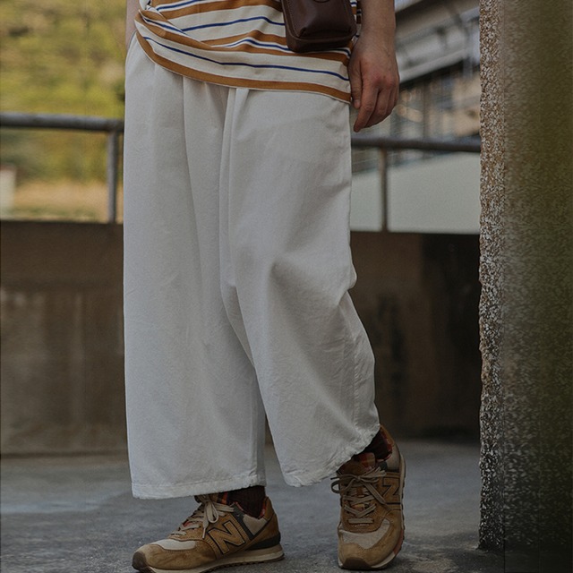 ホワイトの軽やかなコットン生地で清潔感のあるワイドパンツです。