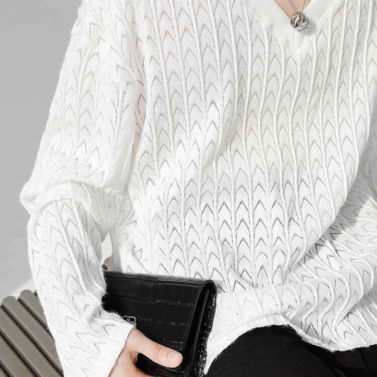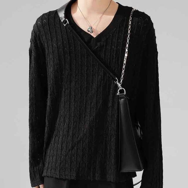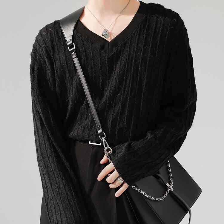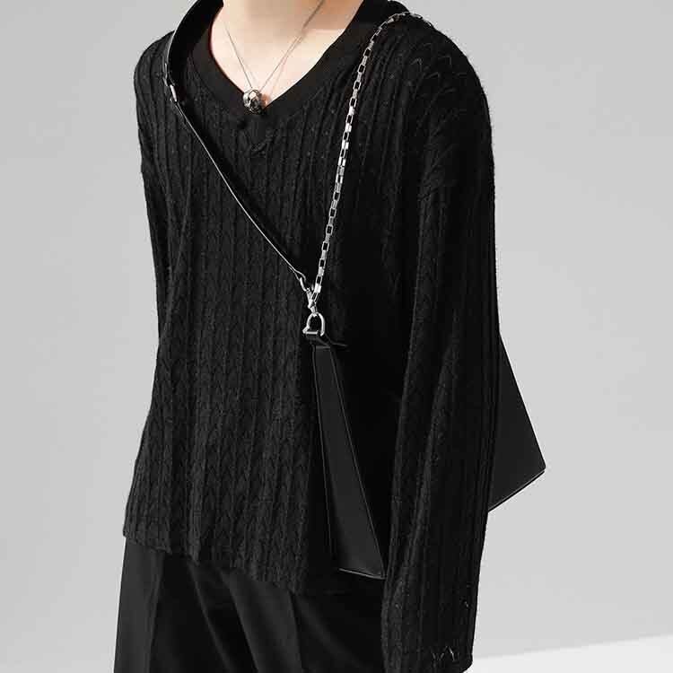 【韓国メンズファッション】透かし編みVネック長袖トップス きれいめ モノトーン ユニセックス BW2272