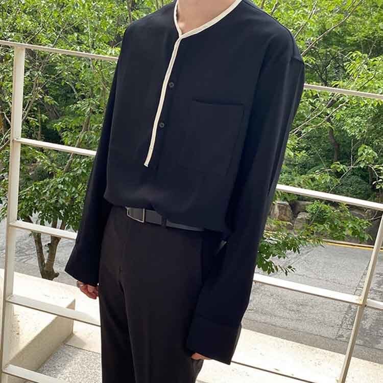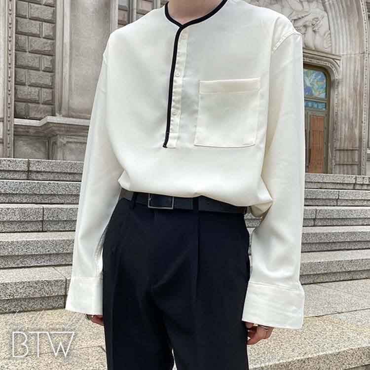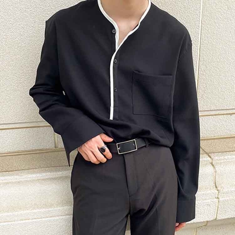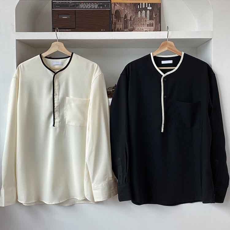 【韓国メンズファッション】バイカラーパイピングヘンリーネックシャツ ノーカラー 長袖 モノトーン BW2286