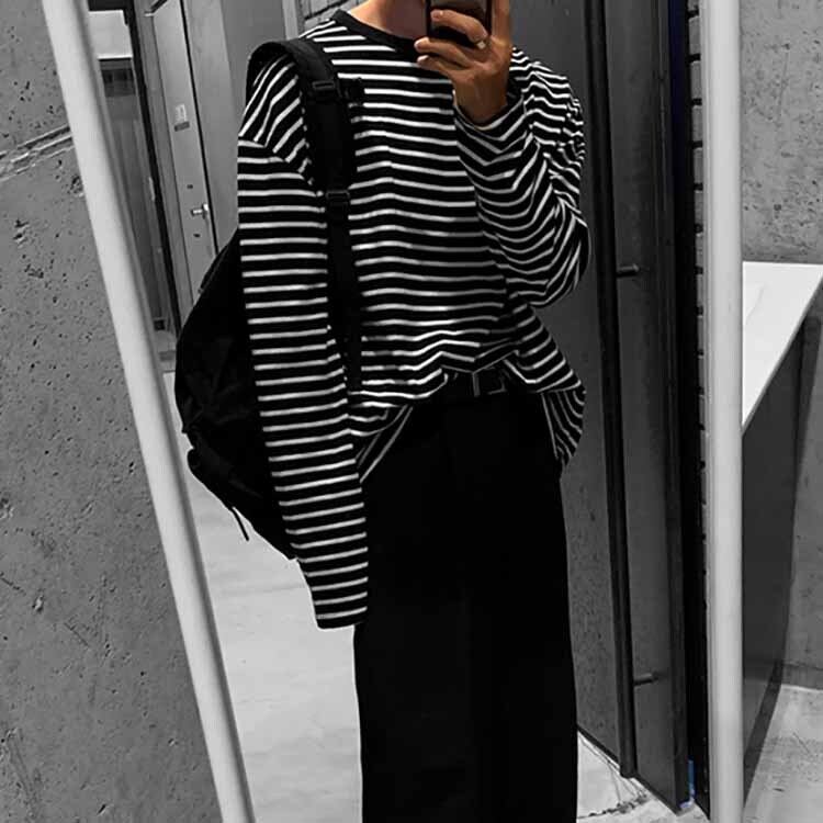 【韓国メンズファッション】ボーダー柄長袖Tシャツ カジュアル ロンT モノトーン ユニセックス BW2311