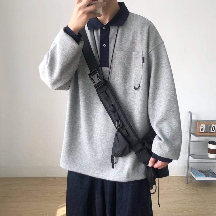 【韓国メンズファッション】バイカラーポロ襟付きスウェット アメカジ ストリート 長袖 シンプル ゆったり ユニセックス BW2327