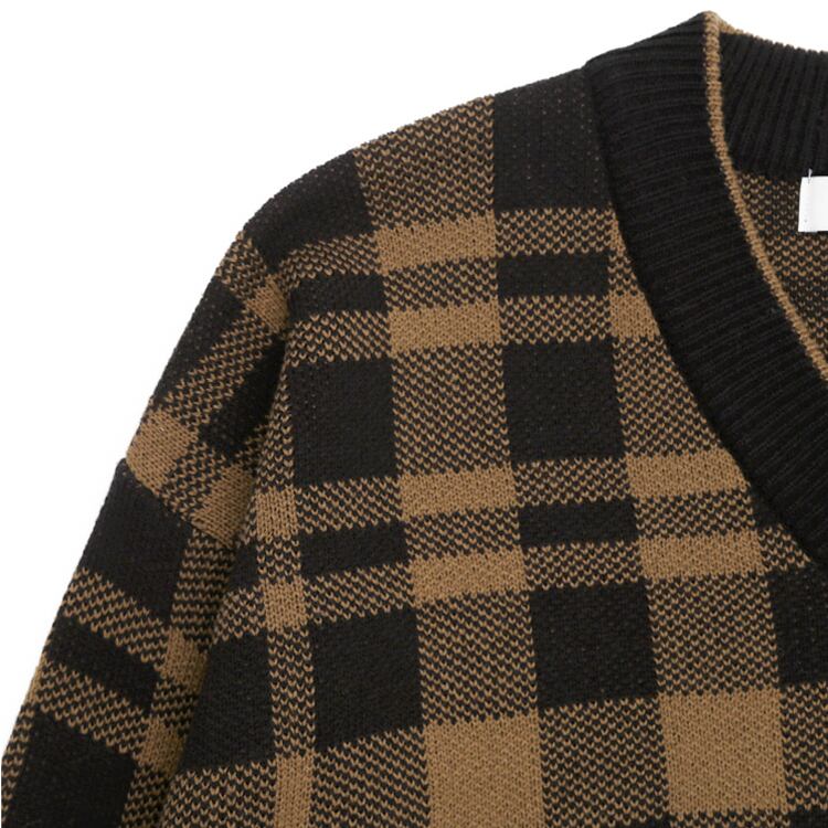 【韓国メンズファッション】チェック柄Vネックセーター レトロ 古着風 カジュアル ドロップショルダー ユニセックス BW2367