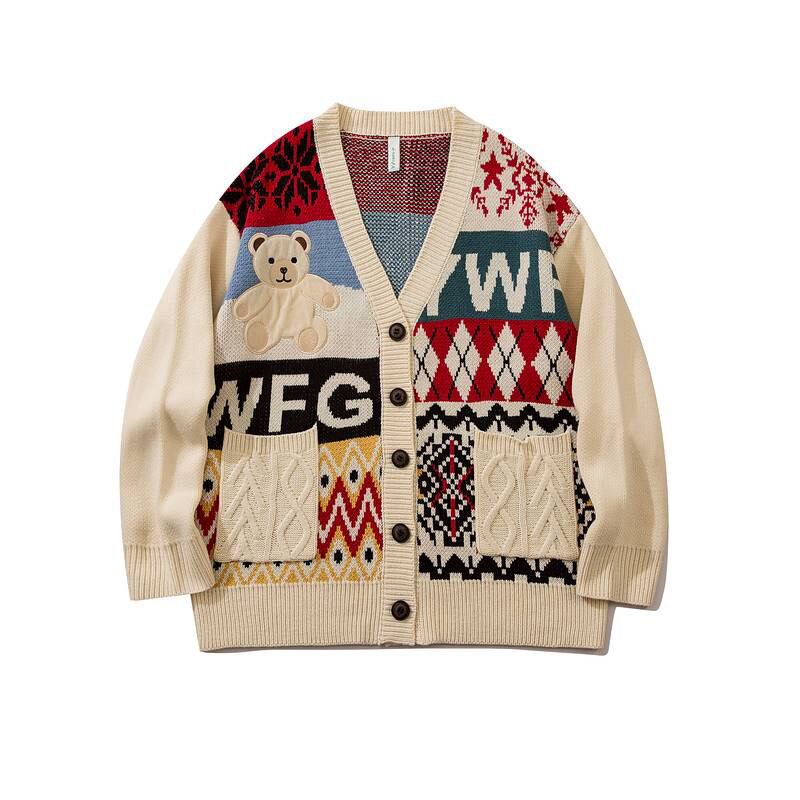 【韓国メンズファッション】パッチワーク風Vネックカーディガン ナチュラル アーガイル ケーブル編み ゆったり カラバリ豊富 BW2382