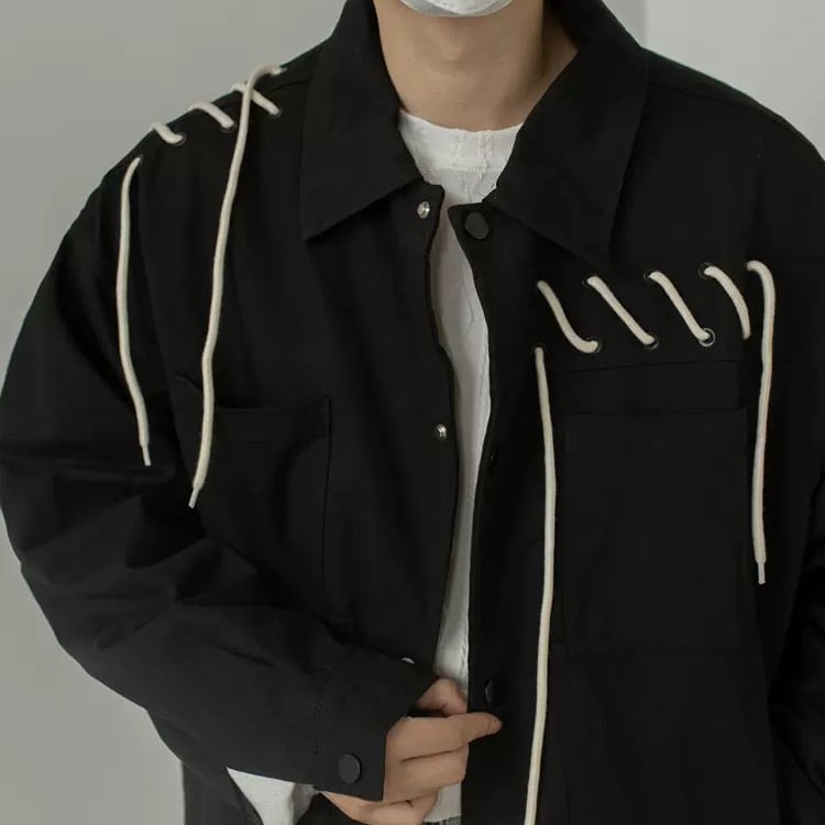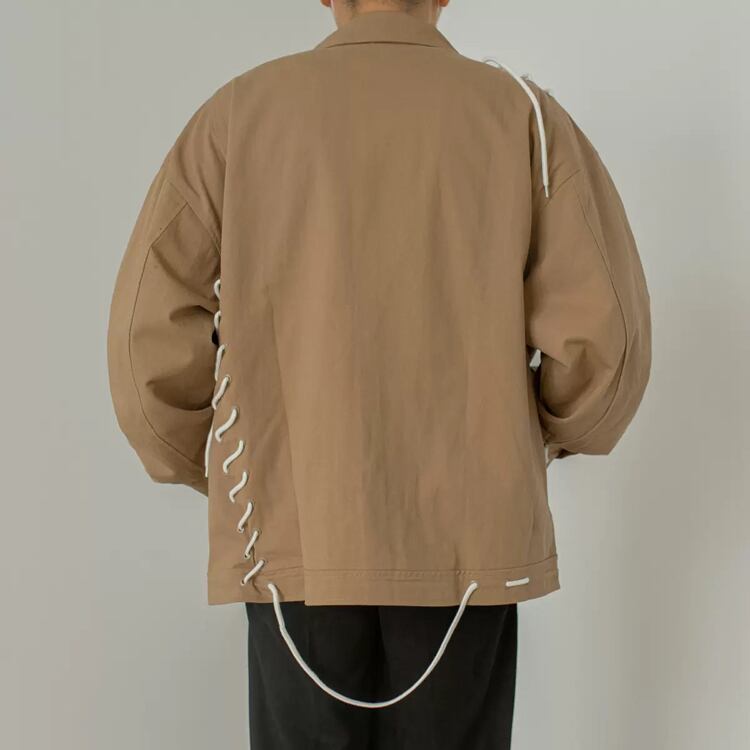 紐とハトメで作られたウィップステッチを胸元、肩、脇に大胆にあしらったワークジャケット。