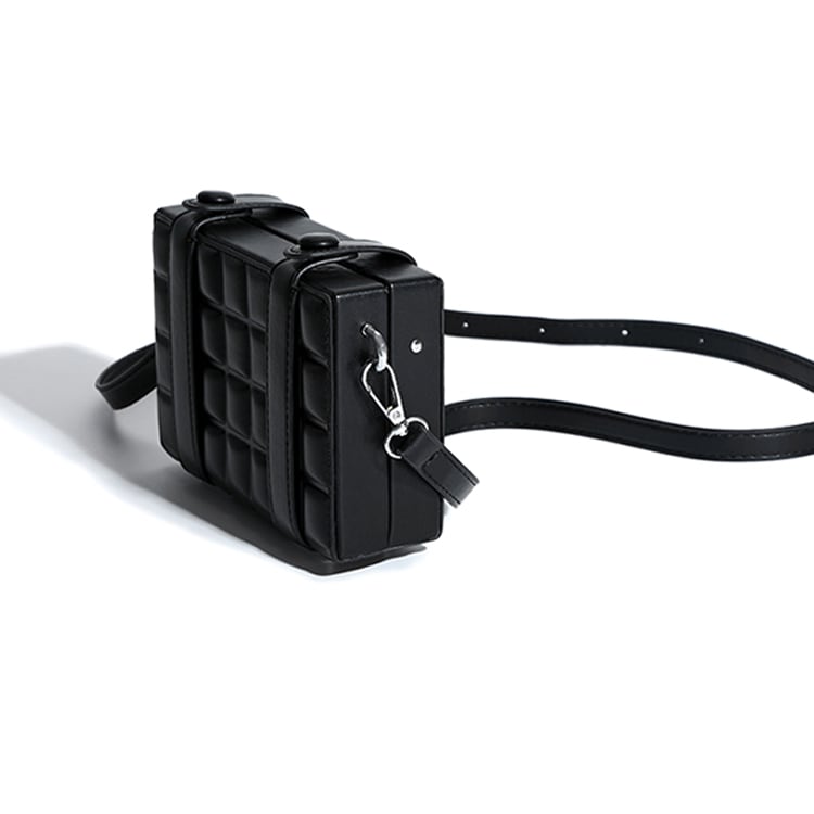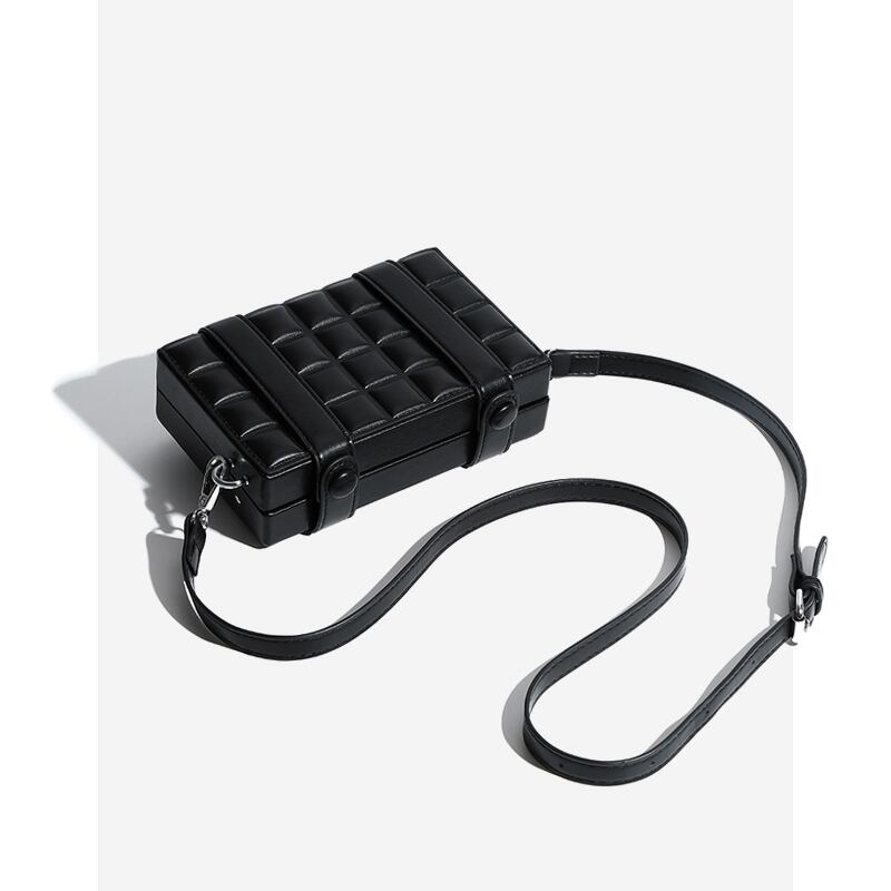 トランクのような角ばったシルエットにエンボスチェック柄のクールさが映えるショルダーバッグ。