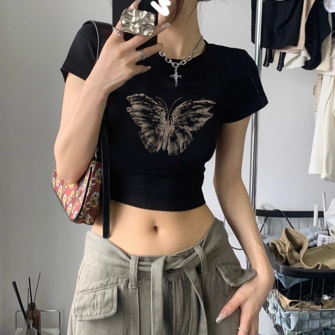 【韓国レディースファッション】バタフライモチーフ プルオーバーTシャツ 大人可愛い きれいめ 半袖 ナチュラル カジュアル 夏 BW2675