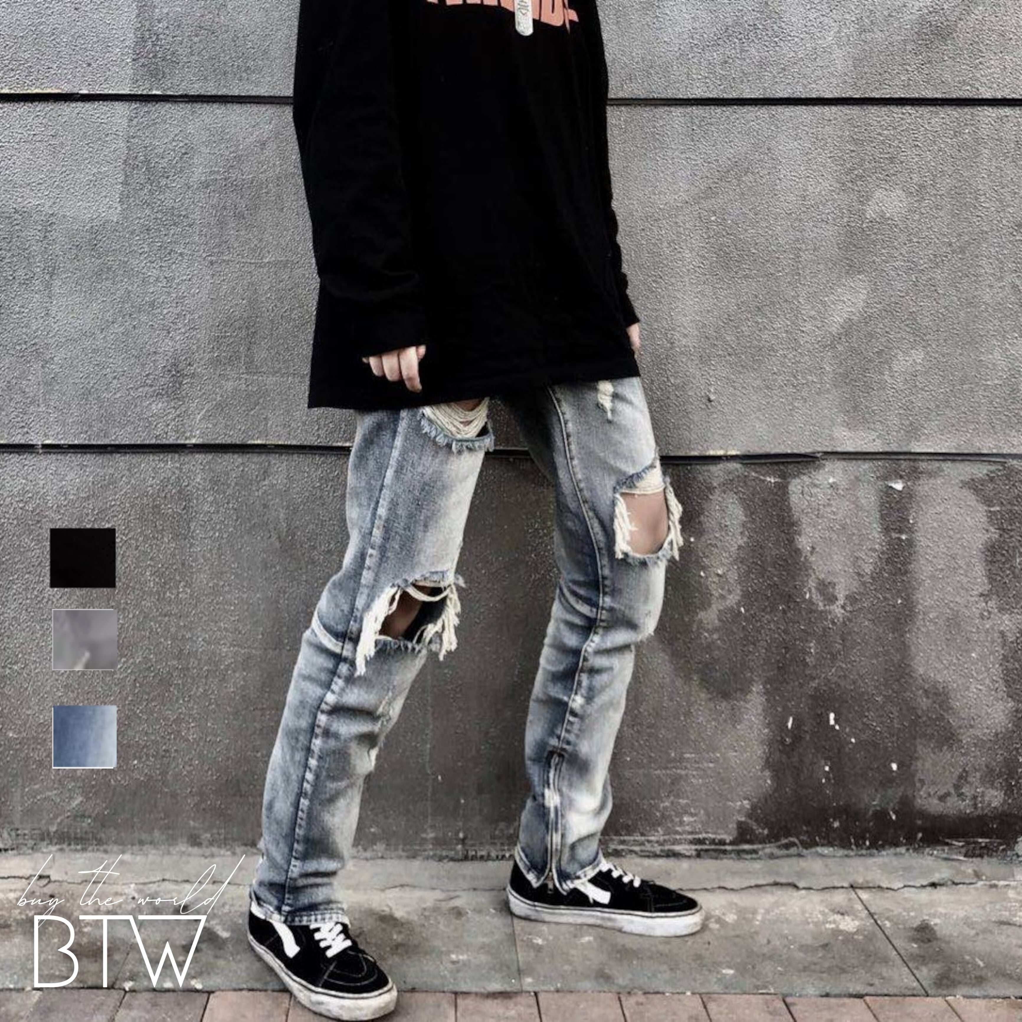 【韓国メンズファッション】スリムフィットダメージデニムパンツ ストレート ナチュラル 大人カジュアル BW2702